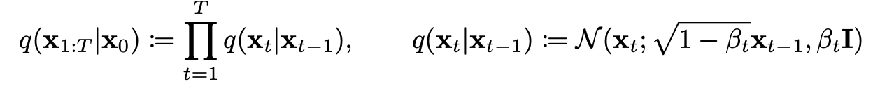 - q(x_1:T | x_0): x_0를 점진적으로 노이즈화하여 순수 가우시안 노이즈 x_T ∼ N(0, I) 로 만드는 과정
