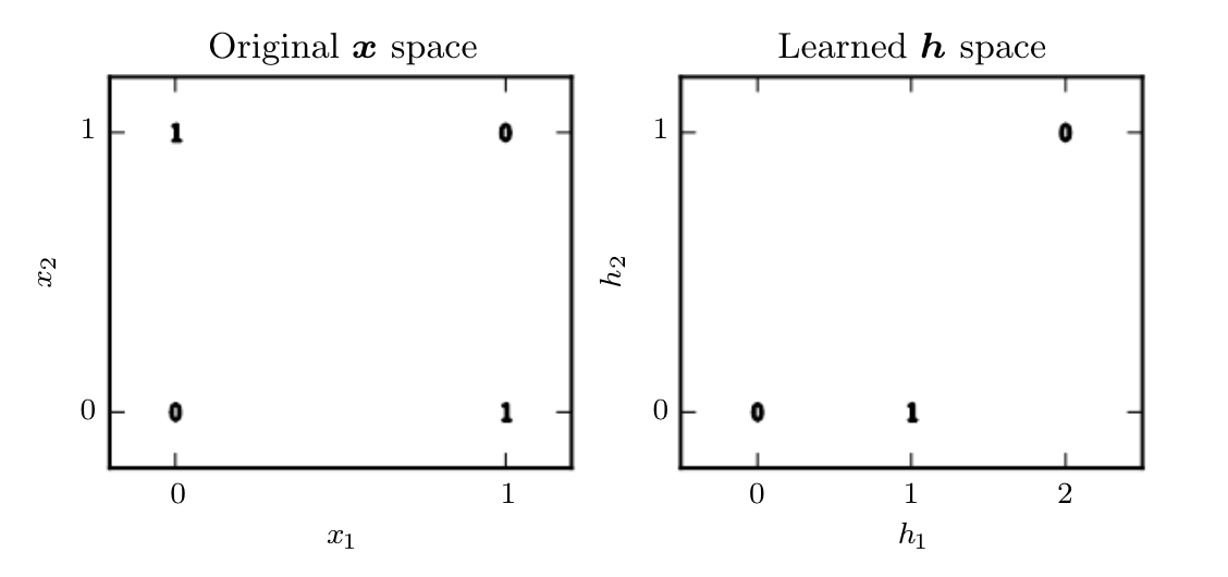 - $h = f^{(1)}(x;W,c)$과 $y=f^{(2)}(h;w,b)$가 연결된 신경망 : $f(x; W,c,w,b) = f^{(2)}(f^{(1)}(x))$