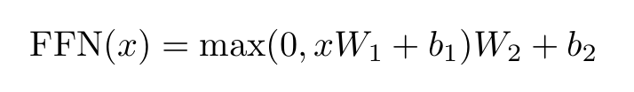 Feed forward 과정에서는 두 번의 linear transformation을 거치고 그 사이에 RELU activation을 사용해준다.