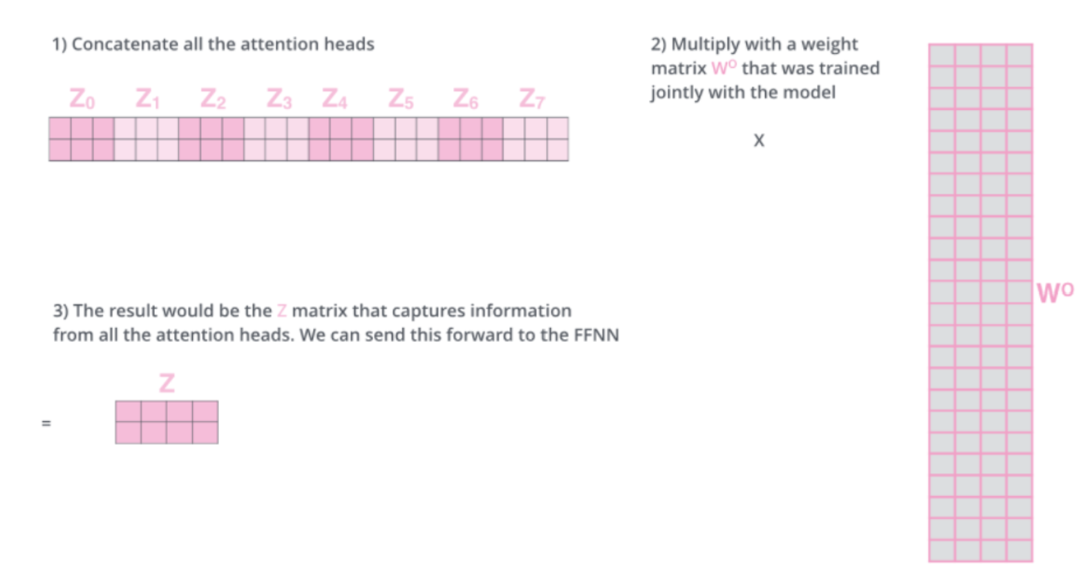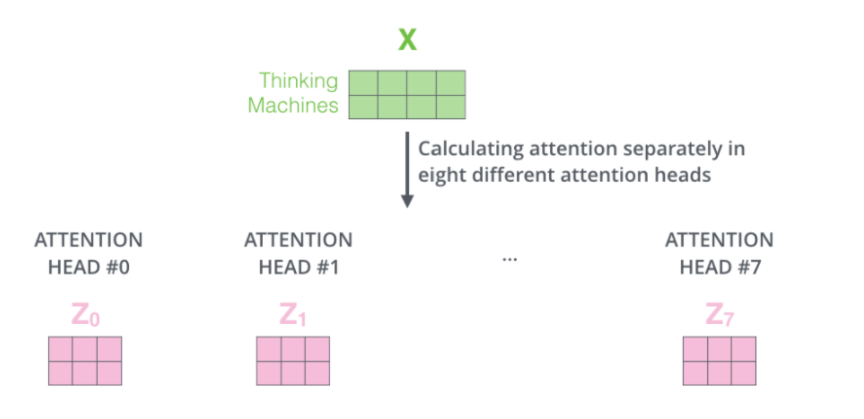 지금까지 설명한 attention은 하나의 head에서 일어난 것이었고 이를 여러번 수행한 것이 multi - head attention이다. 논문에서는 8개의 head를 사용했다. 한번의 attention을 거치면 $N×d_v$ 의 행렬을 얻게 되고 이를 h개의 head 만큼 수행했다고 하면 최종 output은 각 head에서 나온 행렬을 열 방향으로 concat을 해주어 $N×hd_v$ 의 행렬을 얻게된다. 이를 $W_0 = R^{hd_v × d_{\text{model}} } $ 와 곱해주어 처음 input과 동일한 형태의 output을 추출하게 된다. 논문에서는 8개의 head를 사용했다. Head 별로 사용하는 query, key, value의 값은 다르고 이 때문에 문장의 서로 다른 부분에 집중해 전체적으로 문장의 의미를 더 잘 파악할 수 있다고 여겨지고 있다.