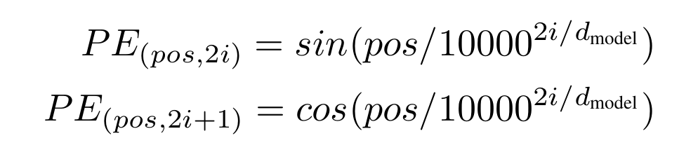 처음에 어떤 문장이 input으로 들어오면 token화 된다. 이는 기존에 정해진 알고리즘을 사용한다. 토큰은 꼭 단어 기준으로 나누어지는 것은 아니므로 단어의 개수와 동일하게 생각하면 안된다. 이후 Input embedding을 통해 각 토큰을 임베딩 차원의 벡터로 만들어준다. (논문에서는 512차원을 사용했다.) Transformer는 Input이 순차적으로 입력되는 것이 아니라 동시에 입력되므로 각 토큰 별로 순서를 사용자가 정해주어야 한다. 이를 위해 positional encoding 과정을 거치게 된다. Positional encoding 시 사용되는 식은 아래와 같다. 각 토큰 별로 512차원의 벡터를 만들어 기존 input 벡터에 더해주는 방식으로 진행된다.