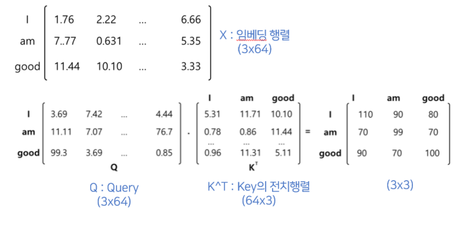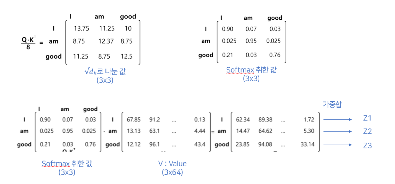이제 $N × d_k$의 query, key, value 가 생겼다. 이제 query와 key를 서로 곱해주고 $ \sqrt{d_k} $ 로 나누어 scaling 해준다. 이는 $d_k$가 커짐에 따라 query와 key 값을 곱했을 때 나오는 값이 커지는데 이를 보완해주기 위함이다. query와 key를 곱해줄 때 차원을 맞춰주기 위해 key matrix를 transpose 시켜준다. 이때 query와 key의 차원이 다르다면 연산이 불가능하므로 query와 key의 차원수는 항상 일치해야 한다. $ QK^T $ 를 해주면 $ N×N $ 행렬이 구해지게 되는데 이는 각 input token이 다른 input token 하고 얼마나 관련이 있는지를 나타내는 행렬로 볼 수 있다. 왜냐하면 사실상 $QK^T$ 연산을 하게 되면 $Q$의 각 행과 $K^T$의 각 열의 내적을 계산하게 되는데 내적 값이 클수록 두 벡터가 일치하는 경향이 크기 때문이다.