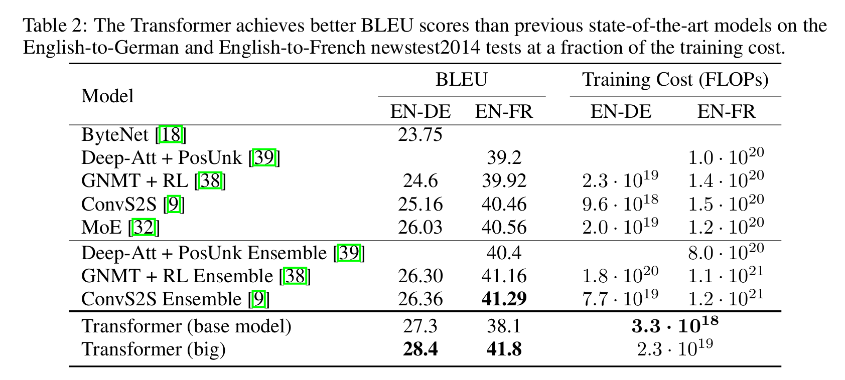 - WMT 2014 영어-독일어 번역 작업에서 BLEU 점수 28.4를 기록하며, 기존 최상위 모델을 능가함.