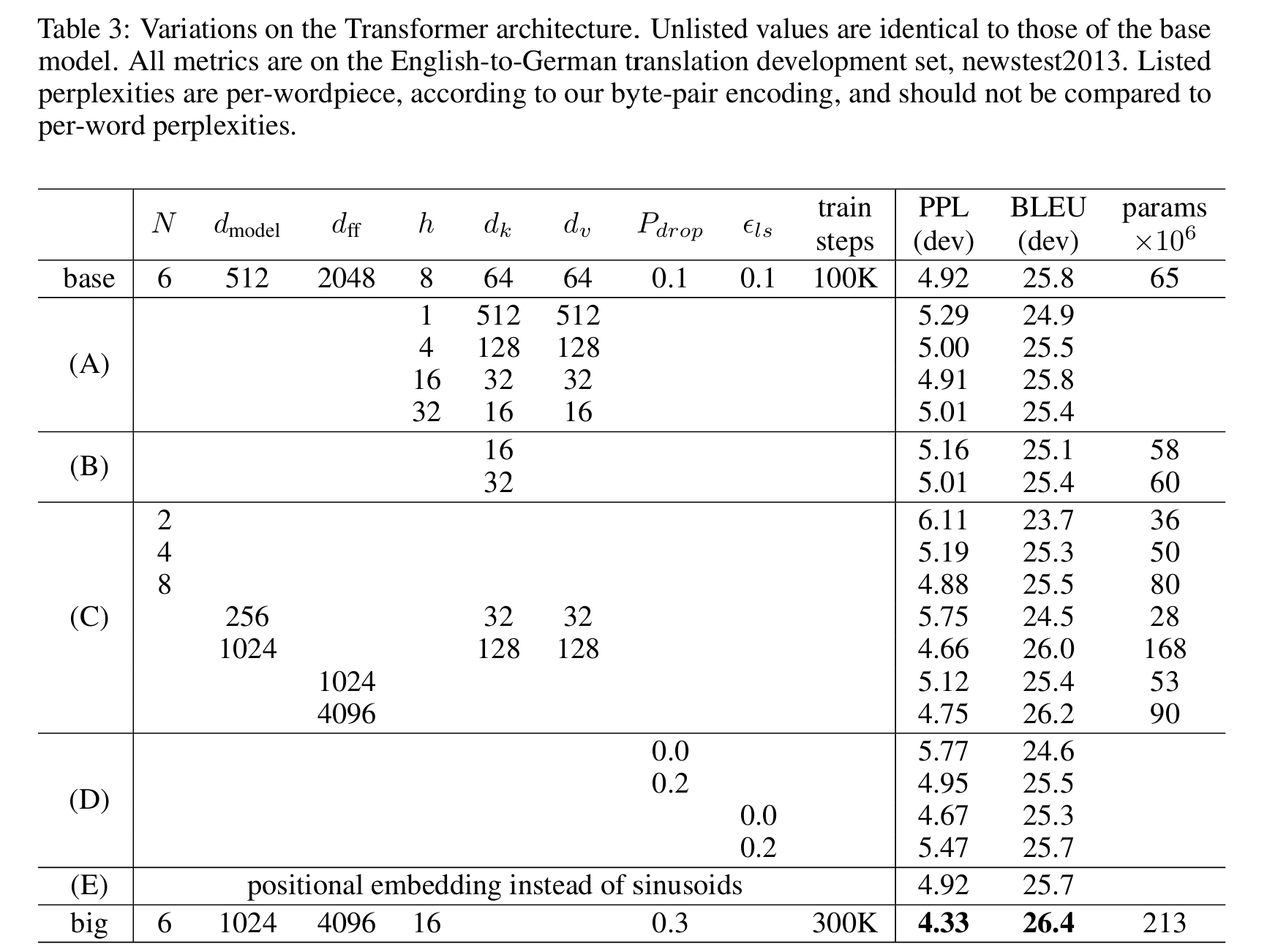 - 위에서 제안한 Transformer의 구조에서 몇 가지 요소들을 변경한 후 English-German translation task에 적용한 실험 결과