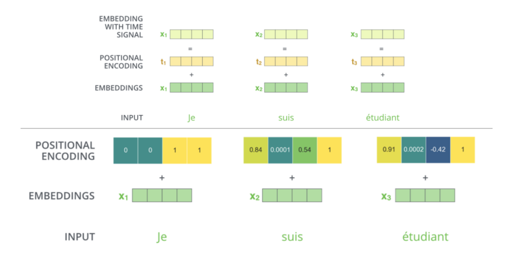 Positional encoding을 거친 후 N x $ d_{\text{model}} $ 차원의 데이터가 encoder로 들어가게 된다. (N: token 수, $ d_{\text{model}} \; : \text{임베딩 벡터 차원, 논문에서는 } 512 $ ). 이 input vector를 사용해 query, key, value 를 만들어준다. 논문에서는 query, key, value를 64 차원으로 설정했다. Input vector를 $X$라고 한다면 query = $ XW^q $ , key = $ XW^k $ , value = $ XW^v $ , $ W^q = W^k = R^{d_{\text{model}} × d_k}, W^v = R^{d_{\text{model}} × d_v} $ 이다. 이때 논문에서는 $d_k$ , $d_v$를 64로 설정하였고 query와 key의 차원은 반드시 일치시켜야 하지만 value의 차원은 달라도 된다.
