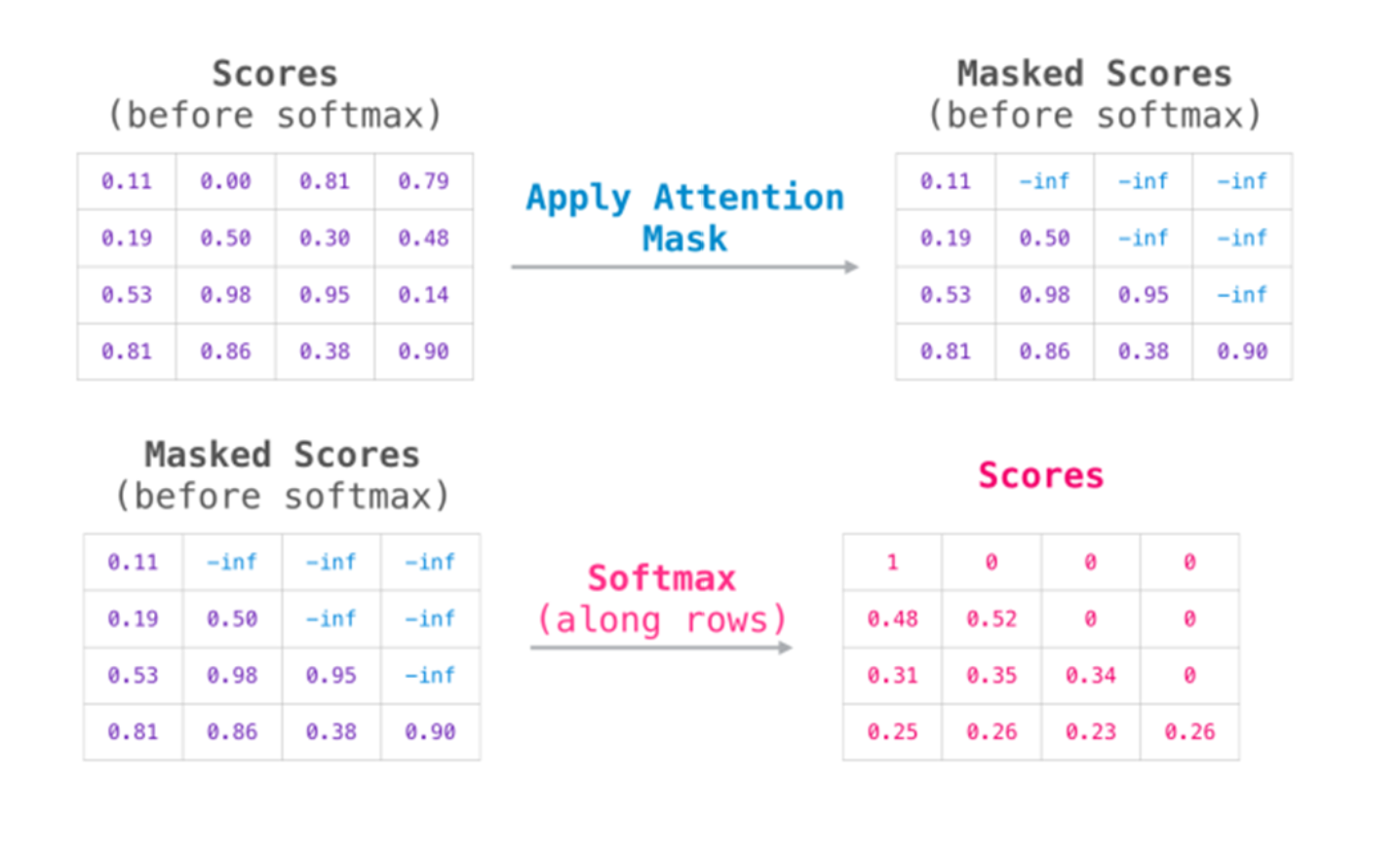 이제 decoder에 대해 알아보자. Decoder도 Encoder와 마찬가지로 embedding과 positional encoding 과정을 거친다. 그리고 Masked - multi head attention 과정을 거친다. Encoder와 다르게 masked - multi head attention을 하는 이유는 Decoder에서 다음 단어를 예측할 때 현재까지의 정보만을 사용하고 미래의 단어를 사용할 수 없기 때문이다. Encoder에서는 모든 단어를 한번에 넣어주었는데 Decoder에서도 똑같이 한다면 이는 일종의 cheating이다. 따라서 우선 모든 단어를 넣고 attention을 진행하되 $QK^T$에서 미래에 해당하는 단어들에 -inf를 부여하여 masking을 해주고 mask 처리된 행렬을 softmax 해준다. 이를 통해 현재 시점까지의 정보만을 활용할 수 있게 한다.