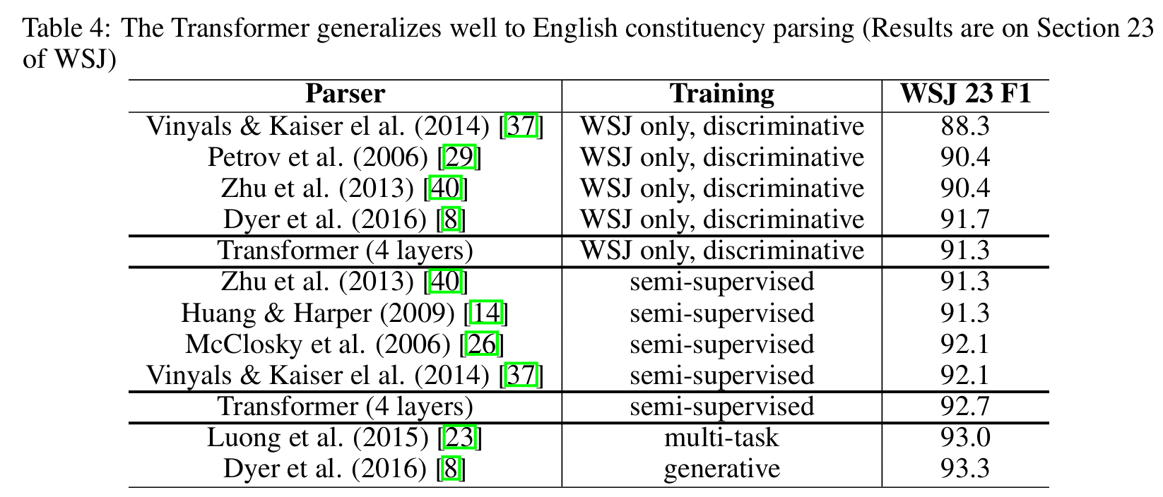 - 다른 task에 대해서도 사용이 가능할지 실험하기 위해, English Constituency Parsing task에 transformer를 적용하였고 상당히 좋은 성능을 제공한다는 것을 확인할 수 있었음.