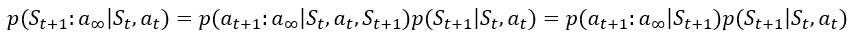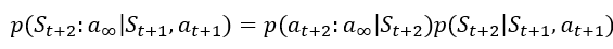 이를 반복하면 $p(S_{t+1}:a_{\infty}|S_t,a_t)=p(S_{t+1}|S_{t},a_{t})p(a_{t+1}|S_{t+1})p(S_{t+2}|S_{t+1},a_{t+1})p(a_{t+2}|S_{t+2})...$이 되게 되는데,