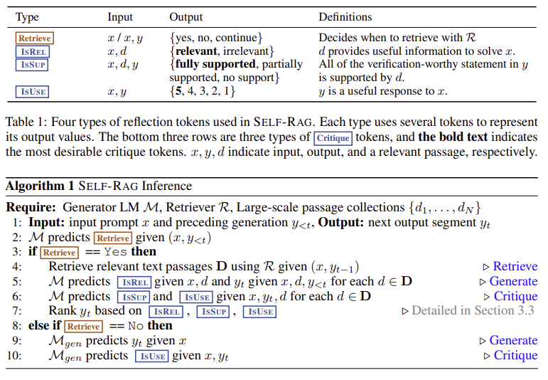 SELF-RAG는 모델이 답변을 생성하면서 Reflection Tokens를 중간중간 예측하게 하는 기법임. 대표적으로 다음 네 가지 유형이 존재: