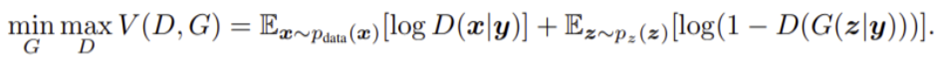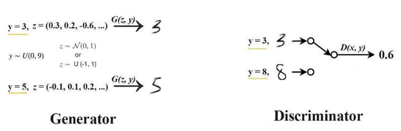 - $y$: Generator와 Discriminator에 주어진 추가 조건(e.g., 클래스 레이블, 추가적인 정보)