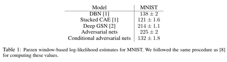 Table 1은 MNIST dataset의 Gaussian Parzen Window-based log-likelihood estimate를 보여준다. 각 10개 class에서 1000개의 sample이 추출되었고, Gaussian Parzen window가 sample들에 적용되었다. 이후, Parzen window distribution 기반으로 density function을 추정하여 test set log-likelihood를 추정한다. Hyeperparamter 최적화와 아키텍처 구조에 대한 추가 연구를 통해 성능 향상이 가능하다.