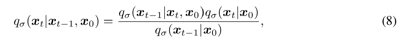 생성 모델은 inference process의 역과정으로 근사되므로 생성 모델이 필요한 iteration 수를 줄이기 위해서는 inference 과정을 다시 생각하여야 한다. (5) 식을 보면 $L_{\gamma}$는 marginal distribution인 $q(x_t|x_0)$에만 의존하고 joint distribution인 $q(x_{1:T}|x_0)$에는 의존하지 않는 것을 알 수 있다. 같은 Marginal distribution에 대하여 다양한 joint distribution이 존재하므로 non-markovian 한 새로운 joint distribution을 떠올려, 즉 새로운 inference process를 만들어 이에 대응되는 새로운 generative process를 만들어낼 수 있다. 이러한 non-markovian process는 DDPM과 같은 목적 함수를 가진다는 것을 추후에 증명한다.