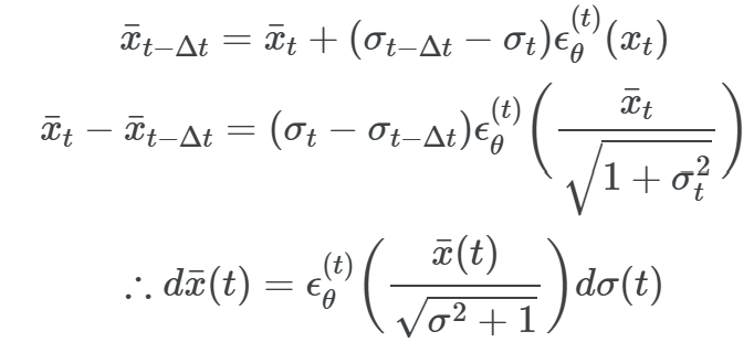 $\sqrt{\frac{1 - \alpha}{\alpha}} = \sigma, \quad \frac{x}{\sqrt{\alpha}} = \bar{x}$로 치환하면 아래와 같이 ODE를 구할 수 있다.