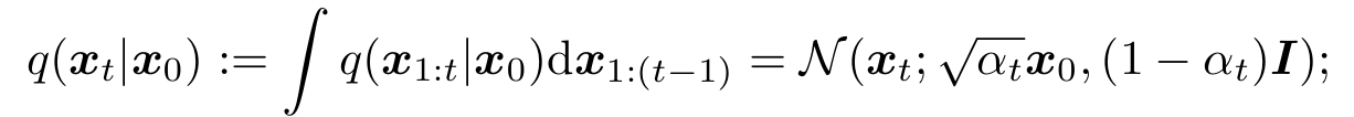 이때 VAE와 같이 전형적인 latent variable model과 다르게 $q(x_{1:T}|x_0)$ 과정을 아래와 같이 고정시키고 학습을 진행한다. 또한 감소 수열 $ \alpha_{1:T} $ ∈ $ (0,1]^T $ 로 매개변수화된 가우시안 분포를 사용한 markov chain을 사용하였다.