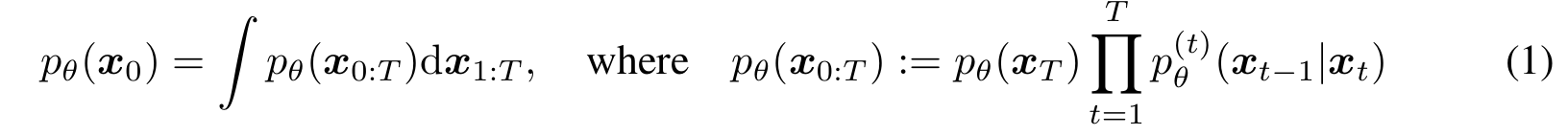 $p_{\theta}(x_T) = N(0, I)$로 고정시키면 generative process는 아래와 같이 나타낼 수 있다.