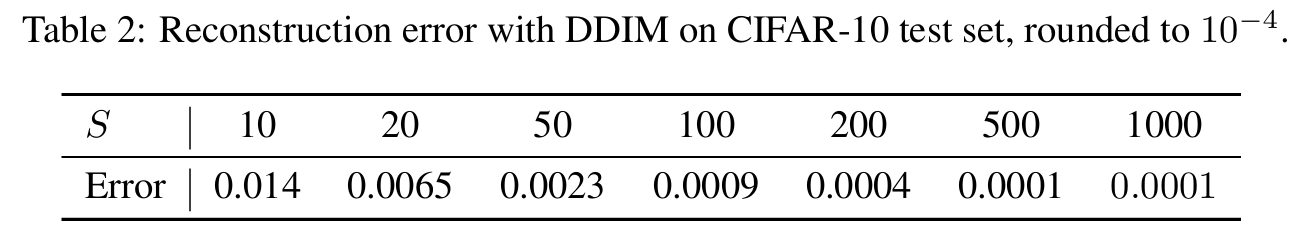 위의 Euler Integration을 이용하여 $x_0$에서 $x_T$를 encoding하고 $x_T$에서 다시 $x_0$을 생성하는 reconstruction을 다양한 step에 대하여 진행해보았다. CIFAR-10 데이터에 대하여 실험을 진행해본 결과 낮은 error를 보였다.
