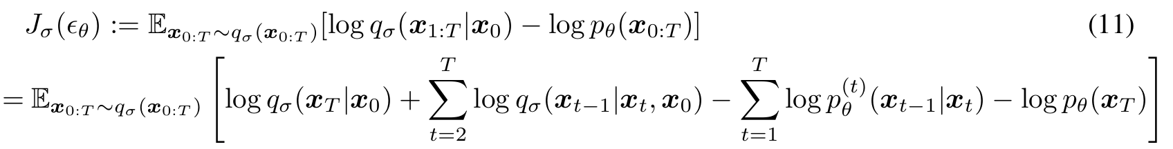 - DDPM을 학습 시킬 때 사용한 목적 함수와 같은 목적 함수를 사용한다. 따라서 기존과 동일한 신경망을 사용하면서 diffusion process만 non-markovian process로 하여 다양한 생산 모델을 설계할 수 있다.