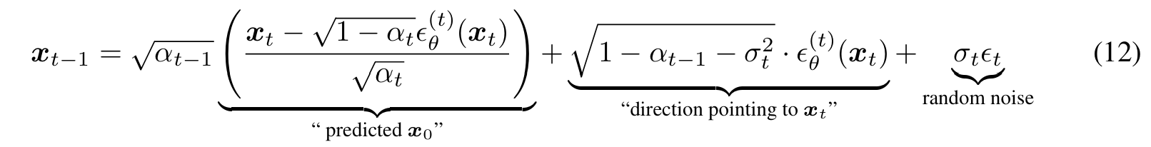 식 (12)에서 $\sigma_t = 0$을 대입하면 DDIM의 샘플링 식이 나온다. 이는 다음과 같이 쓸 수 있으며 이는 상미분방정식(ODE)를 풀기 위한 Euler integration과 비슷해진다.