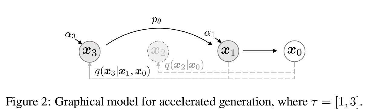 Forward process가 $x_{1:T}$ 모두에 정의되지 않고 부분 집합인 {$x_{\tau1},..., x_{\tau s} $} ($\tau$ 는 길이가 S인 [1,...T]의 부분 수열)에 대해 정의된다고 생각해 볼 수 있다. 이때 $q(x_{\tau_i}|x_0) = \mathcal{N}\left(\sqrt{\alpha_{\tau_i}} x_0, (1 - \alpha_{\tau_i}) I\right)$ 가 marginal distribution에 일치하도록 $x_{\tau1}, ..., x_{\tau s} $ 에 대한 forward process를 정의한다. 그러면 generative process는 $\tau$를 뒤집어 샘플링하며 이를 샘플링 궤적이라 한다. 샘플링 궤적의 길이가 T 보다 짧다면 샘플링 과정의 계산 효율이 증가하게 된다.