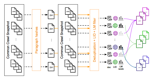 각 스냅샷에는 압축되지 않은 일반 텍스트가 20~30TB 정도 포함되어 있으며, 이는 약 30억 개의 웹 페이지에 해당한다. 각 스냅샷을 독립적으로 다운로드하여 처리하며, 각 스냅샷에 대해 WET 파일을 각각 5GB의 조각으로 재그룹화한다. 그리고 이러한 조각들은 하나의 항목이 하나의 웹 페이지에 해당하는 json 파일로 저장된다.
