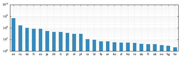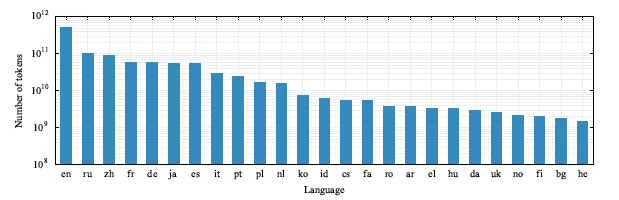 결과 데이터셋에 대한 메트릭은 다양한 언어에 대한 문서 수, 토큰 수, 언어 모델 퍼플렉서티 등이 포함된다. 중복 제거 단계 이후 각 언어별 토큰 수는 히스토그램으로 시각화되어 있으며, 로그 스케일로 표시된다. 필터링 단계에서는 5-gram Kneser-Ney 모델이 사용되며, 이 모델은 KenLM 라이브러리에서 구현되었다. 이 모델은 대규모 데이터를 처리하는 데 효율적이며, 필터링 단계에서는 Wikipedia와 같은 고품질 소스에 가까운 문서를 선택한다. 이러한 메트릭은 결과 데이터셋의 품질과 크기를 평가하는 데 사용된다.