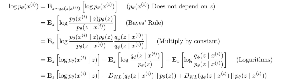 베이즈정리와 log의 성질에 의해 log가능도는 reconsturct된 input data - x가주어졌을때의 KL(z의 사후분포, z의 모분포) + KL(z의 phi모수의 사후분포, z의 theta 모수의 사후분포)