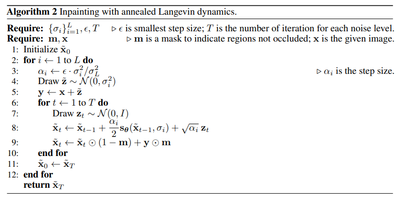 위 그림에서 볼 수 있듯이 NCSN은 좋은 inpainting 성능을 보여준다. 이를 위해선 약간의 수정된 알고리즘만 적용하면 된다. 알고리즘은 아래와 같다.