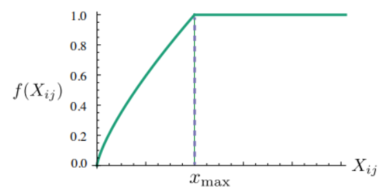가중치 함수 f는 드문 공출현이 과도하게 높은 가중치를 받지 않도록 비감소 함수여야 하며 또한 빈번한 공출현에 대해서는 과도하게 높은 가중치를 받지 않도록 해야 하기 때문에 다음의 식이 제안된다.