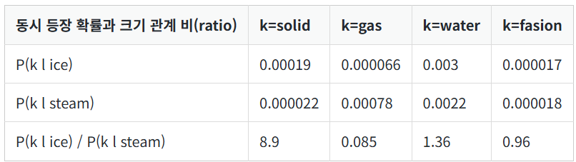 수식적으로 다시 정리하여 언급하면 k가 solid일 때, P(solid l ice) / P(solid l steam)를 계산한 값은 8.9가 나온다.. 이 값은 1보다는 매우 큰 값입니다. 왜냐면 P(solid | ice)의 값은 크고, P(solid | steam)의 값은 작기 때문이다.