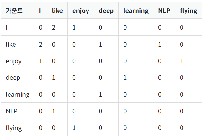 위 행렬은 행렬을 전치(Transpose)해도 동일한 행렬이 된다는 특징이 있습니다. 그 이유는 i 단어의 윈도우 크기 내에서 k 단어가 등장한 빈도는 반대로 k 단어의 윈도우 크기 내에서 i 단어가 등장한 빈도와 동일하기 때문입니다.