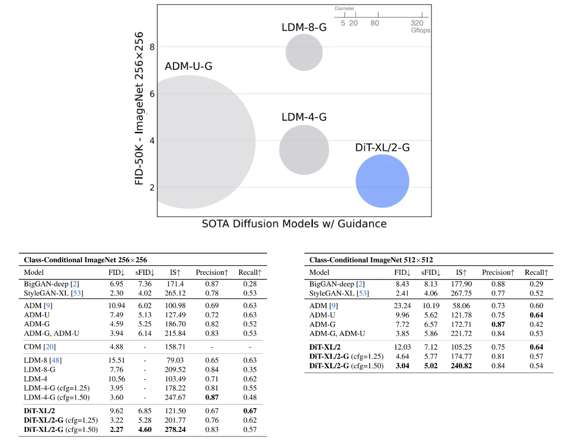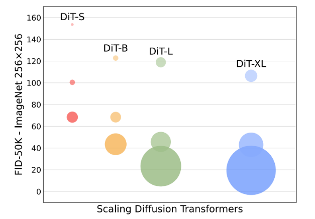 - Diffusion Transformer 는 기존의 U-Net 백본 모델보다 높은 성능 및 효율성 확장성을 보인다