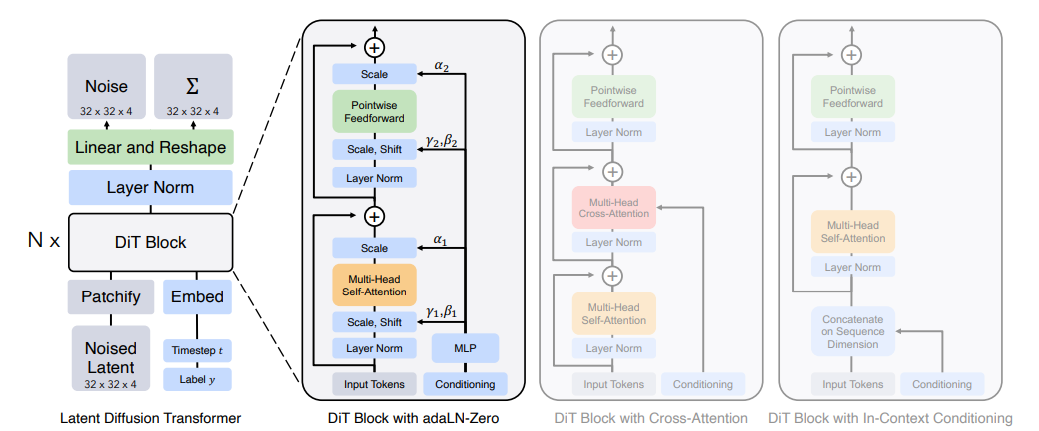 - DiT에서는 $\gamma$와 $\beta$를 회귀하는 것 외에도 DiT 블록 내의 Residual Connection 전 Scaling을 진행하는 scale factor $\alpha$를 추가한다 (초기 $\alpha$가 0이다)