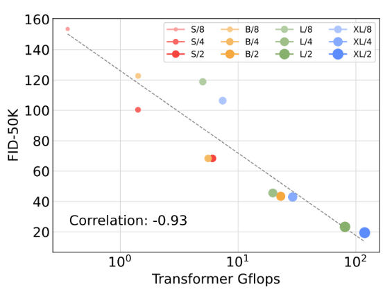 Gflops에 따른 FID를 나타낸 그래프 : Gfloops와 FID-50K 간의 강한 음의 상관관계가 있음을 확인 ⇒ Gfloops증가가 모델 성능향상의 핵심
