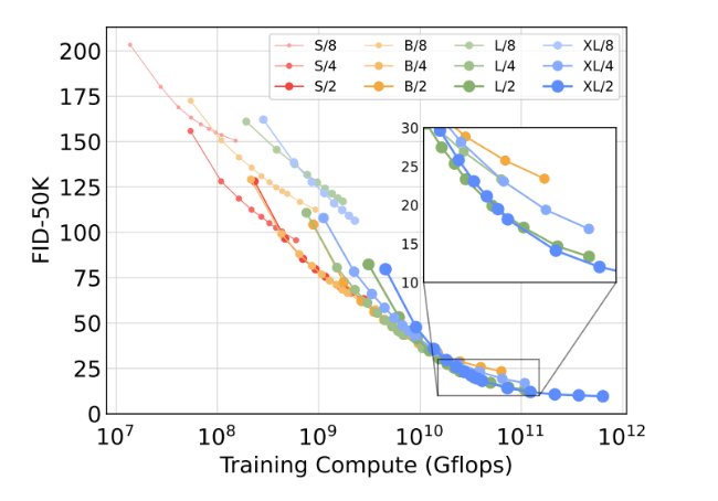 → 작은 DiT모델은 더 오래 훈련해도 더 적은 단계로 훈련된 큰 DiT모델에 비해 계산 효율이 떨어진다