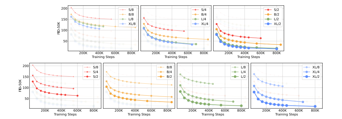 - DiT (S, B, L, XL), Patch size (2, 4, 8) 총 12가지 케이스를 비교
