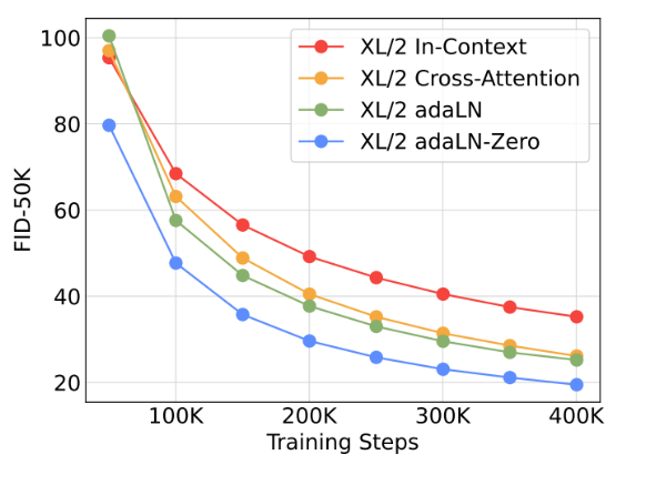 - adaLN-Zero이 Cross-attention, In-Context 매커니즘보다 낮은 FID를 보여줌