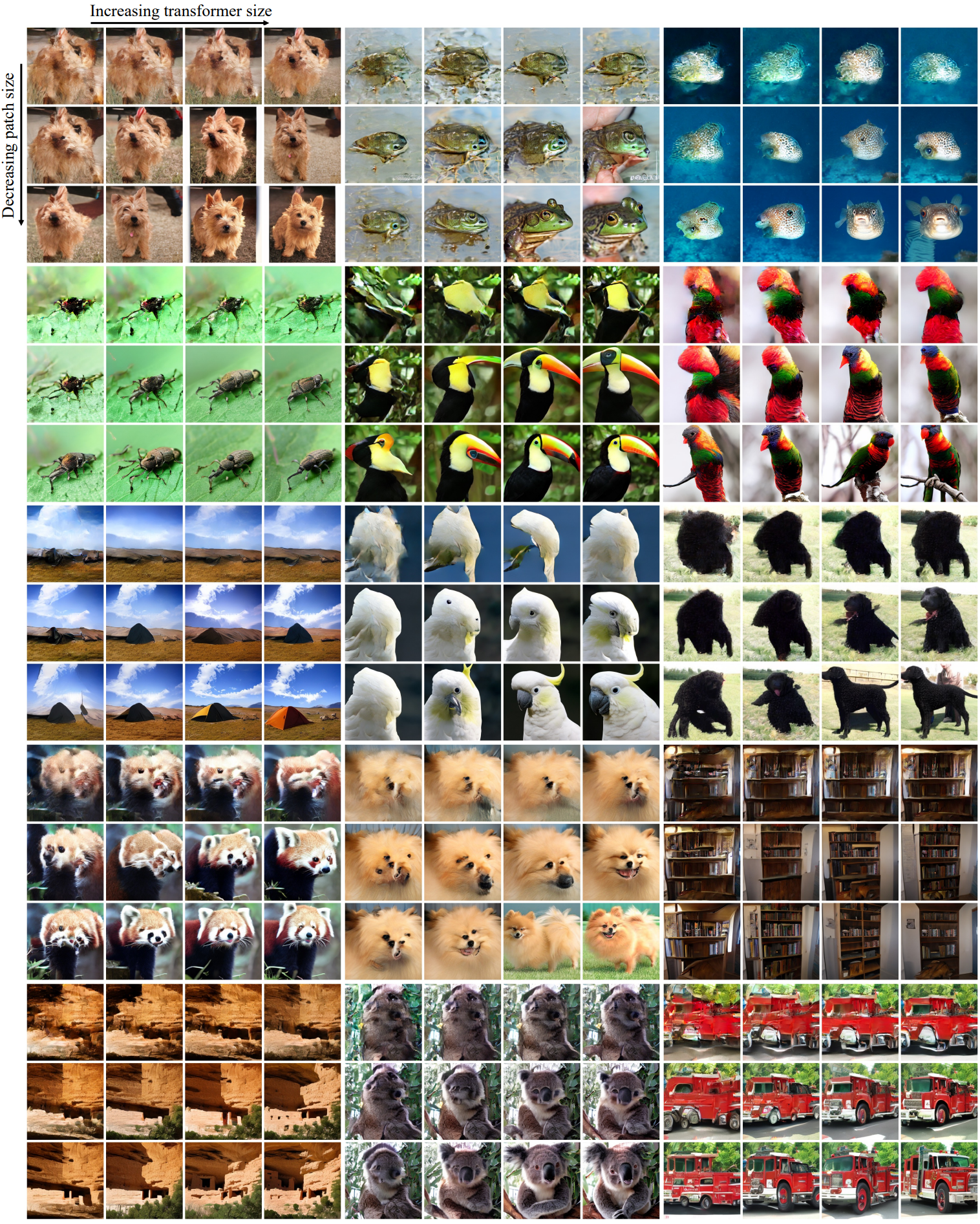 패치 사이즈와 Transformer 크기에 따른 이미지 품질 변화