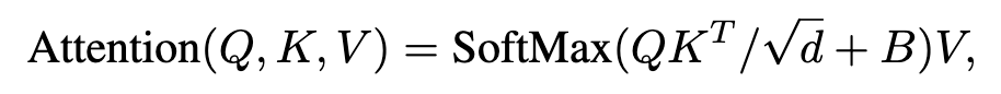 → 자기 어텐션을 계산할 때 상대적 위치 바이어스 B∈R^{(M^2)×(M^2)} 를 포함