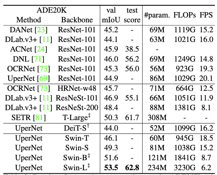 3. Swin Transformer는 COCO에서 이전 State-of-the-Art를 +2.7 Box AP와 +2.6 Mask AP로, ADE20K에서는 +3.2 mIoU로 크게 능가하며, 트랜스포머 기반 모델이 vision backbone으로서 가진 잠재력을 입증합니다.
