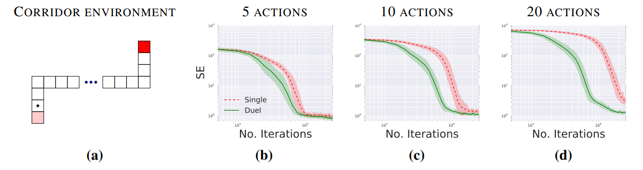 dueling architecture은 더 빠르게 옳은 action을 찾아감이 실험으로 확인되었다.
