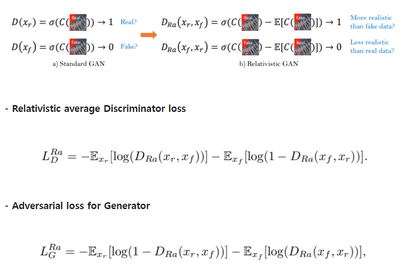 기존의 SRGAN의 판별자는 하나의 input 이미지(x)가 진짜이고 자연스러운 것일 확률을 추정했습니다. relativistic discriminator는 실제 이미지(Xr)가 가짜 이미지(Xf) 보다 상대적으로 더 현실적일 확률을 예측합니다.