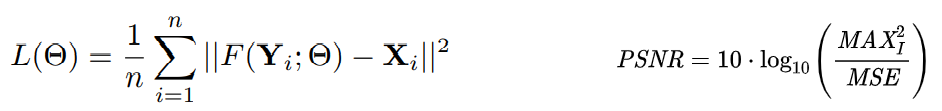 그리고 얼마나 잘 고해상화 되었는지는 PSNR이라는 수치를 이용합니다. PSNR은 최대 신호 대 잡음비(Peak Signal-to-noise ratio, PSNR)라고 하며, 신호가 가질 수 있는 최대 전력에 대한 잡음의 전력을 나타낸 것입니다. 주로 영상 손실 압축에서 화질 손실 정보를 평가할때 사용됩니다. PSNR은 신호의 전력에 대한 고려 없이 MSE를 이용해서 계산 할 수 있습니다. 즉 MSE가 낮을수록 높아지는 값이므로, PSNR이 높으면 더 잘 초해상화된 이미지라고 할 수 있습니다. MSE와 PSNR의 수식은 아래와 같습니다.