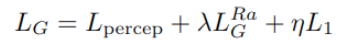 최종적으로 loss는 perceptual loss, RaGan loss, L1 loss가 사용됩니다.
