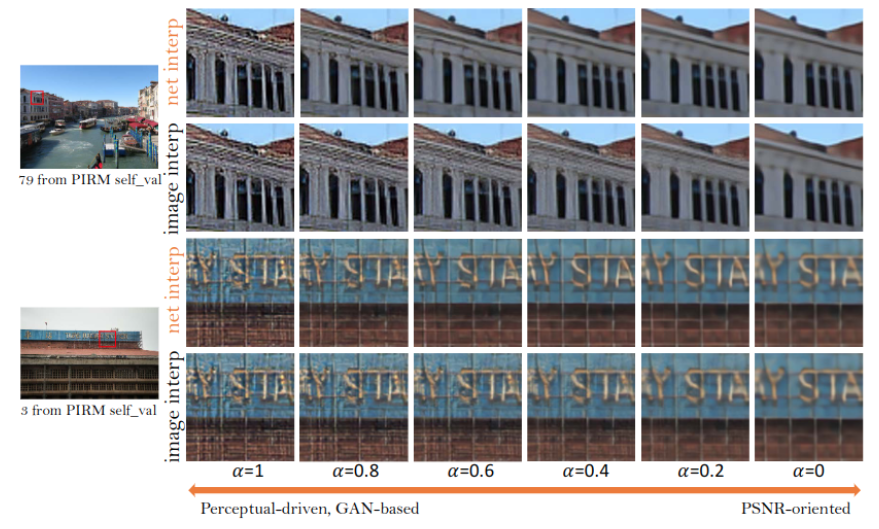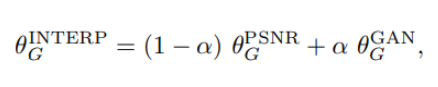 PSNR-oriented network(Gpsnr)을 학습한 후, 미세 조정을 통해 GAN-based network(Ggan)를 얻었습니다. 이것으로 기존 GAN 방식의 학습이 진행되면서 perceptual quality가 좋아져도 artifact가 생기는 문제를 어느정도 해결합니다. 또 모델을 재학습시킬 필요없이 지속적으로 지각 품질과 정확도의 균형을 유지할 수 있게 해줍니다.