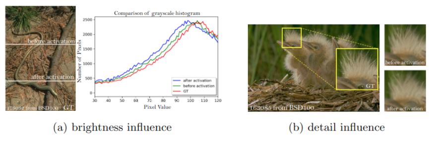 2) 활성화 후 feature들을 사용하는 것은 ground-truth 이미지와 비교했을 때 일관성이 없는 복원된 밝기를 유발합니다.