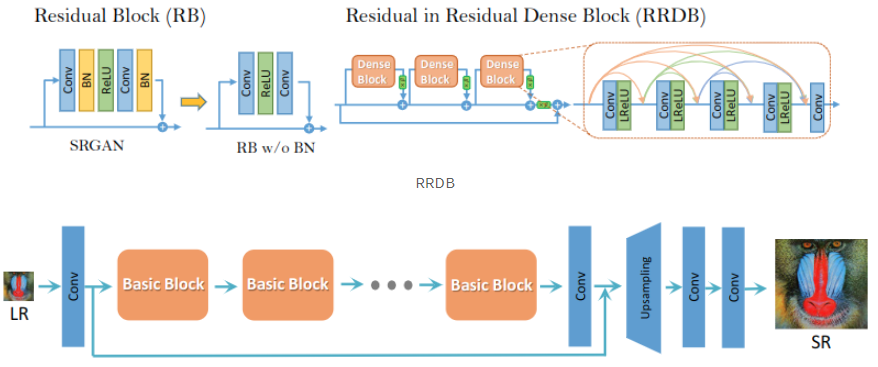 기존의 SRGAN의 구조는 그대로 사용하며 Block만 교체한 모습입니다.