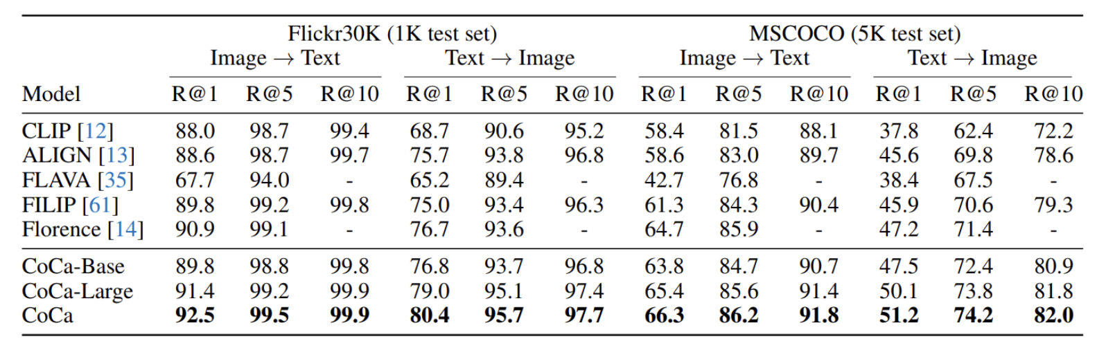 위 표를 참고해보면, 이미지-텍스트 검색 작업에 대해 MS-COCO 및 Flicker30K 데이터셋에서 SoTA 성능 달성한 것을 확인할 수 있다.