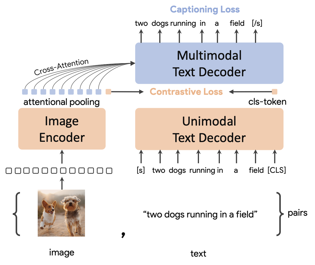 - 이는 둘의 손실 함수(Contrastive Loss, Captioning Loss)가 서로 충돌할 가능성이 있기 때문에 이 둘을 동시에 학습하기 어려웠음