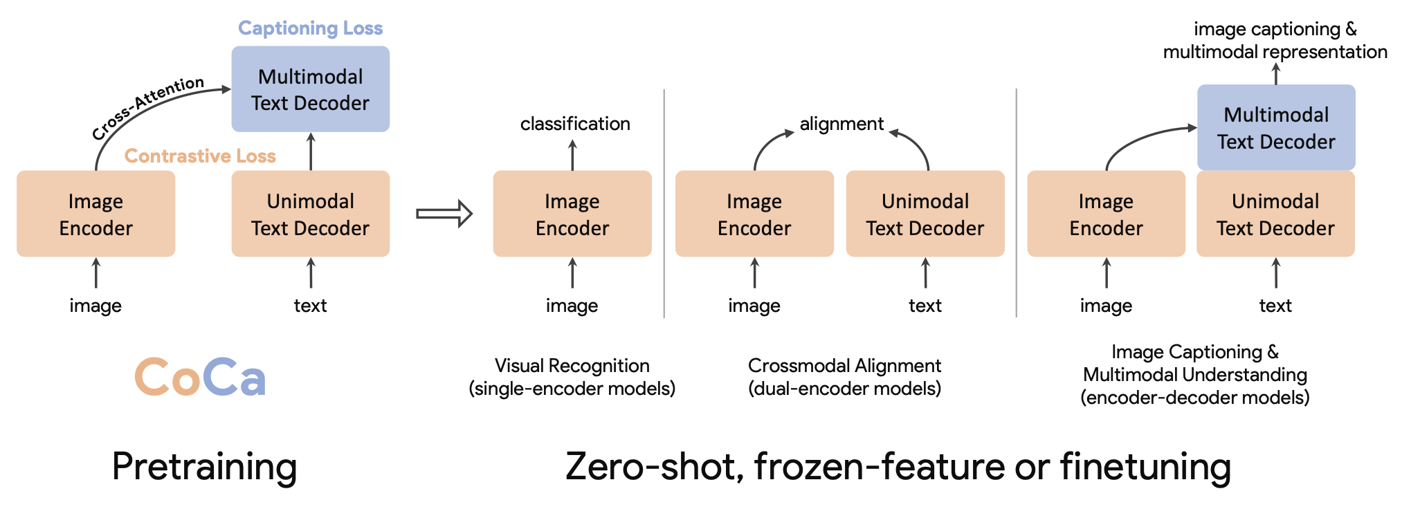 CoCa 모델은 pretraining 과정에서 Contrastive Loss와 Captioning Loss를 최적화하며, 이후, 다양한 방식으로 다운스트림 작업에 사용될 수 있다.