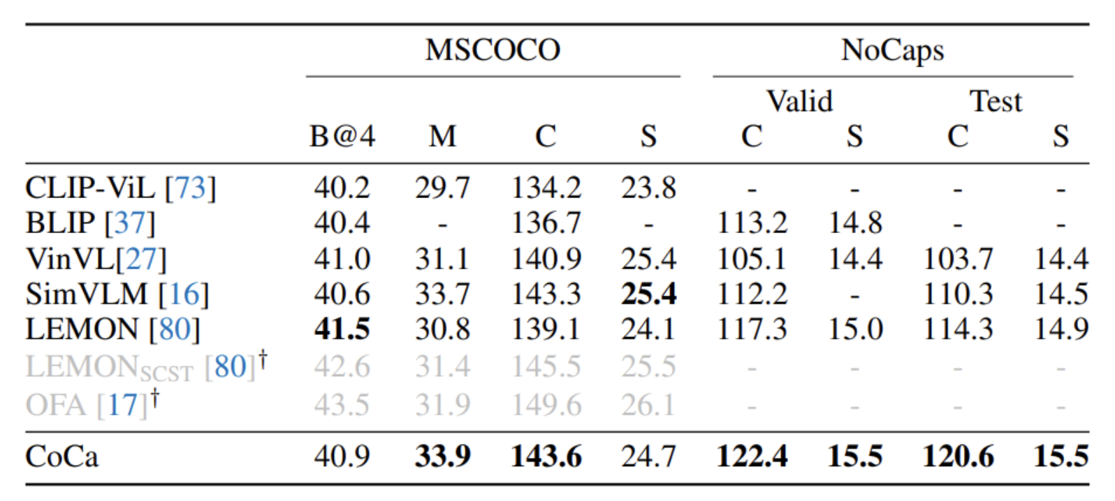 이번엔 이미지 캡셔닝 작업에 대한 성능을 비교한 표다. MSCOCO와 NoCaps 데이터셋에서 CoCa는 전반적으로 가장 높은 CIDEr(C) 점수를 보인 것을 확인할 수 있다. 특히 NoCaps에서 CoCa는 Zero-shot 학습 환경에서도 뛰어난 성능을 보여준다. 다양한 지표에서 고르게 높은 성능을 보인다는 것을 통해 기존 모델들 보다 범용성이 있다는 것을 보여준다.